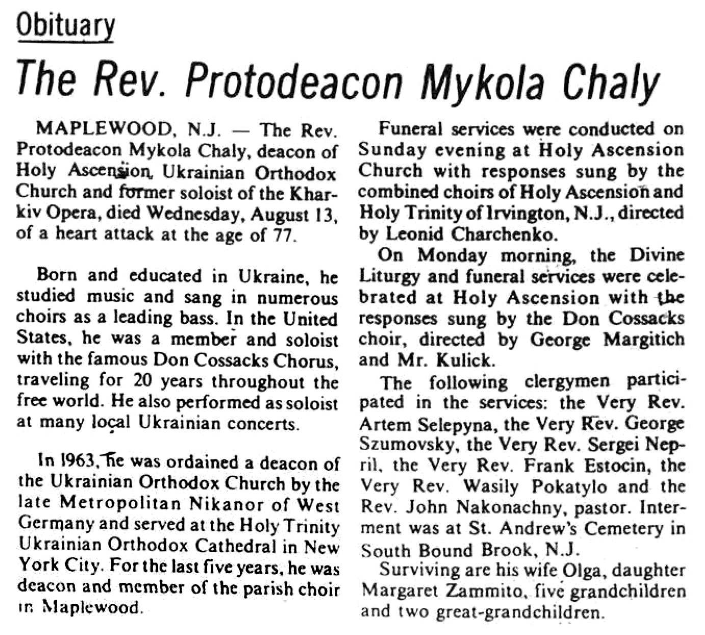MAPLEWOOD, N.J. – Reverend Protodiakon Mykola Chaly, Diakon von Holy Ascension, Ukrainisch-Orthodoxe Kirche und ehemalige Solistin der Kharkov Opera, starb am Mittwoch, den 13. August im Alter von 77 Jahren an einem Herzinfarkt.