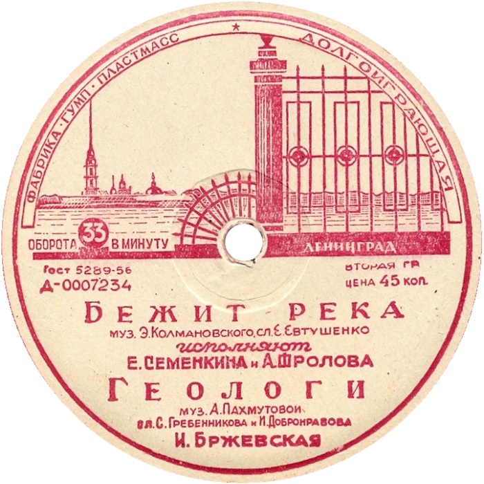 | Д-0007234 | #1 | | Ekaterina Semenkina, Antonina Frolova, acc. V. Kuzovlev and A. Grafov (accordion duo) | 1960 Moscow | Leningrad - Plastmass Factory of GUMP, Gramplasttrest and major plants | 36115 | |