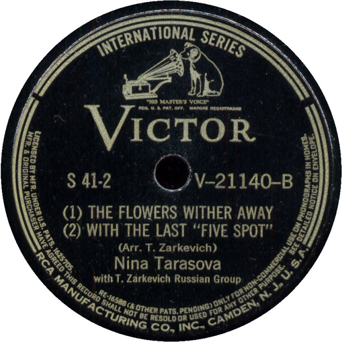 V-21140-A (BS-073794) | 1 | | Нина Тарасова с русской группой Фёдора Заркевича, акк. оркестр, дирижёр Фёдор Яковлевич Заркевич | Нью-Йорк | Виктор (international series), Виктор | S 41-1 26-5032 (BS-073794-1) | |