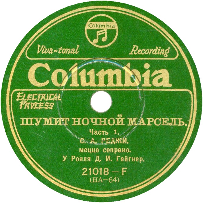21018-F (HA-65) | | | Софья Александровна Реджи, акк. Давид Исаакович Гейгнер (рояль) | 1932 Харбин | Columbia (Viva-Tonal, Харбин) | 21018-F | |