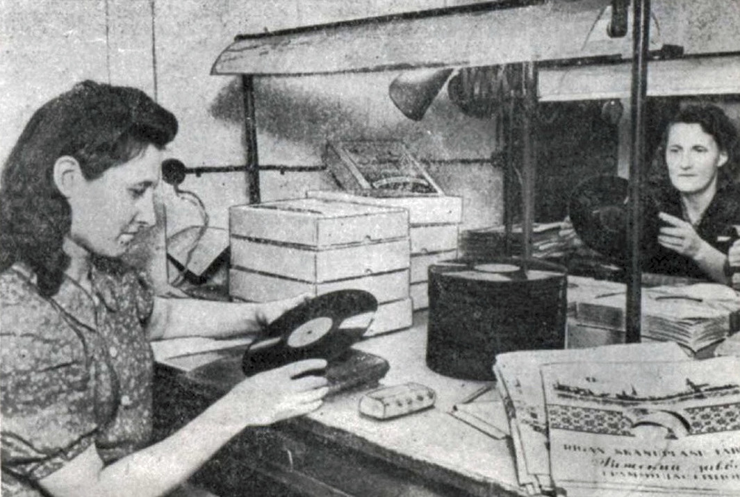 After the liberation of Riga, thanks to the help of the enterprises from Moscow and Leningrad, the plant was in a short time restored and on February 13, 1945 it resumed production of gramophone records. At this time worked on it 29 workers, 4 students and 3 persons from engineering and technical stuff. In the post-war years, the plant printed records from all-union numbering matrices sent from Moscow as well as individual Bellaccord Electro matrices from 1930s.