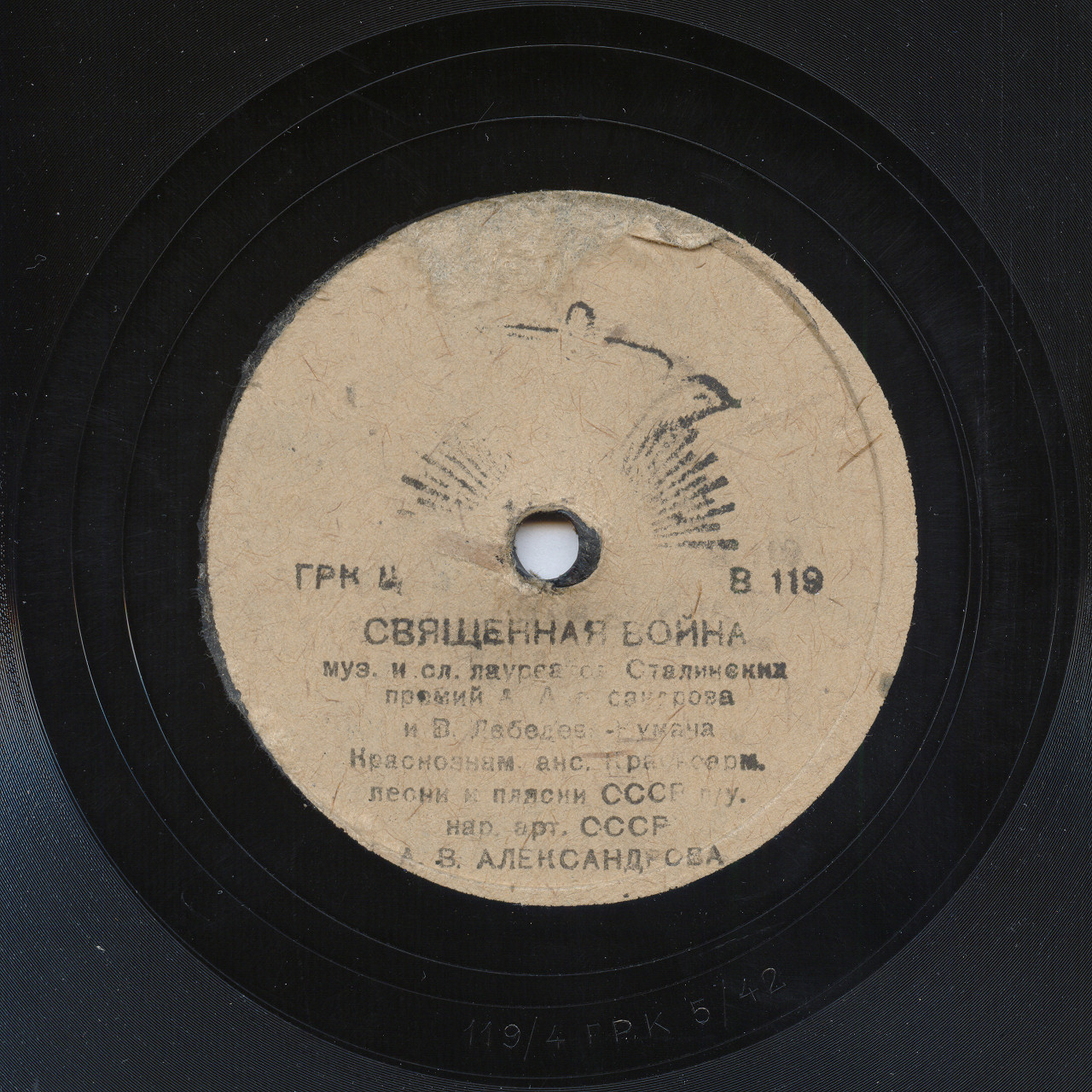 Как уже упоминалось, запись 1941 г. была сделана неполным составом ансамбля, поэтому мы использовали более позднюю фонограмму — осени 1942 г. Песня звучит в исполнении Краснознаменного ансамбля красноармейской песни и пляски под управлением А.В. Александрова.