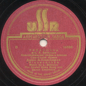 Под номером 14618 (Г-135) хорватская народная песня Душа-Марица. Исполняет Краснознамённый ансамбль. Дирижер Б.А.Александров, солист О.Разумовский. На обороте 14620 (Г-141) словацкая народная песня Пастух. Солист В.Никитин