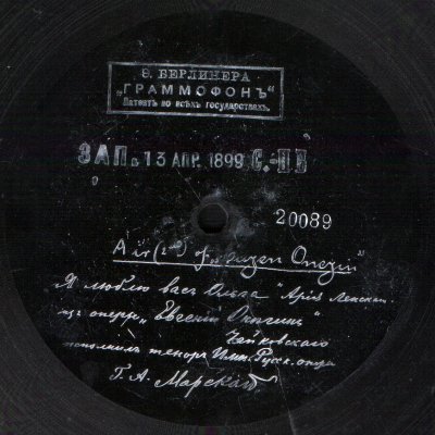 Образец грампластинки, записанной Дарби во время первой русской сессии в апреле 1899 года. Из коллекции Дмитрия Головко, г.Междуреченск.