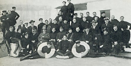 a semicircle, in their dark blue uniforms, the trousers with a broad, dark