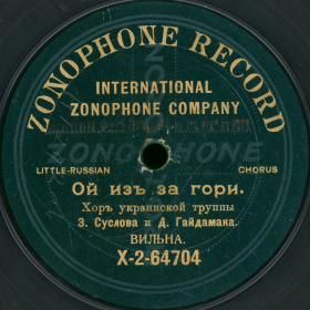 X-2-64704 (1292ab) | | | Choir of the Ukrainian troupe of O.S. Suslov and D.A. Gaidamak (Lev Sabinin), Conductor O.S. Suslov, D. A. Gaidamak (Lev Sabinin) | 01-07-1909 Wilna | International Zonophone | | |