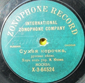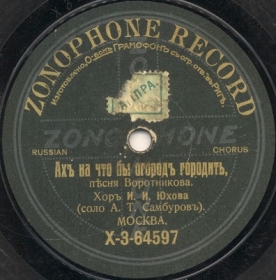 X-3-64526 (971ae) | | | Chorus of I.I.Yukhov, Conductor Ivan Yukhov, Solo by A.T. Saburov | 11-06-1910 Moscow | Zonophone (Gramophone, semicircular inscription) | Х 3-64526 | |