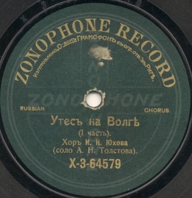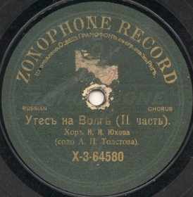 X-3-64580 (14737b) | | | Chorus of I.I.Yukhov, acc. piano, Conductor Ivan Yukhov, Solo by A. Tolstov | 02-09-1910 Moscow | Zonophone (Gramophone, semicircular inscription) | X 3-64579 | |
